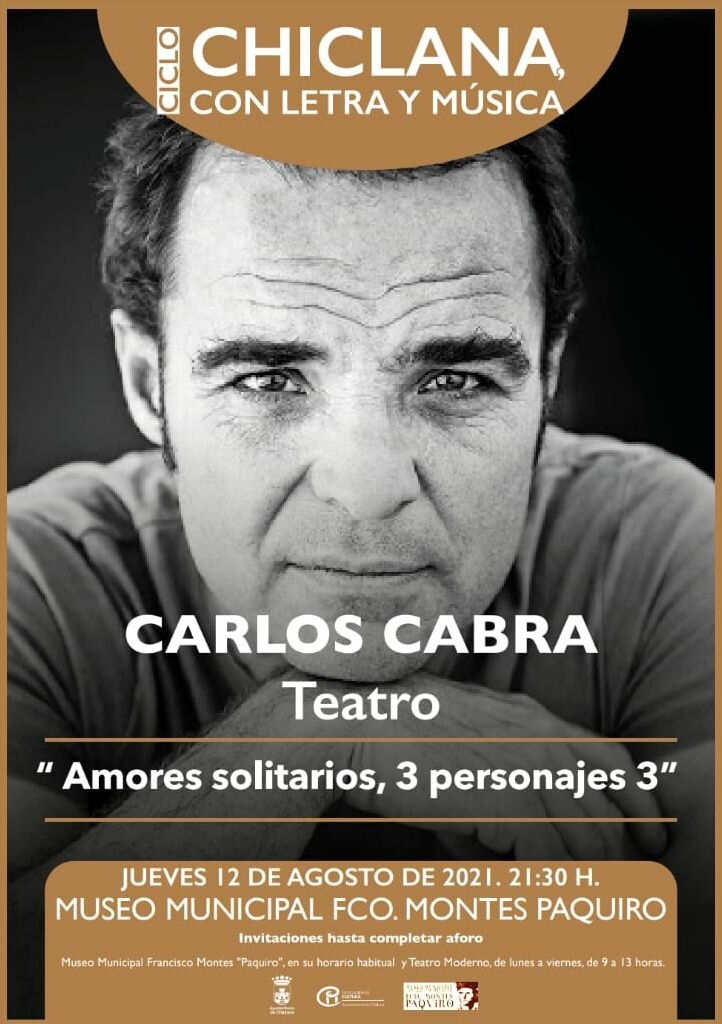 El actor Carlos Cabra protagoniza este jueves, a partir de las 21.30 horas, la obra de teatro ‘Amores solitarios. 3 personajes 3’, que se desarrollará en los jardines del Museo Municipal Francisco Montes ‘Paquiro’. Un espectáculo organizado por el Ayuntamiento de Chiclana, a través de la Delegación de Cultura, con la colaboración del Museo ‘Paquiro’.