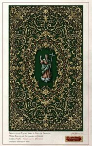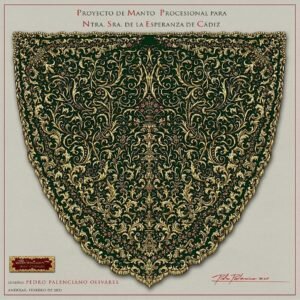 – Como obra culmen de este proyecto el nuevo manto para Nuestra Señora de la Esperanza. Bordado en oro sobre terciopelo verde y donde se conjugan todos los estilos de bordado presentes en el palio. Se componen de distintas cenefas asimétricas más pequeñas en la parte exterior y dirigiéndose hacia la Virgen. Se presenta una cenefa de flores en sedas de colores entre hojas de acanto que se van haciendo más grandes conforme van ascendiendo. En la zona central bordados más grandes con jarrones de flores con sedas de colores al igual que en las esquinas. En la zona cercana a la virgen un bordado más fino y delicado con remate de puntilla o concha a diferencia de la cola del manto que va rematado con flecos que se van haciendo de mayor tamaño y que lo dotan de movimiento.