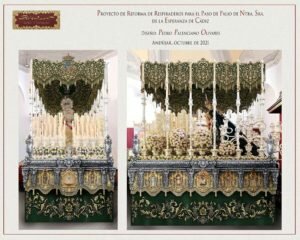 – Manteniendo nuestros respiraderos que tanta identidad aporta a la Hermandad, se potencian enmarcándolos en un molduró de orfebrería con una sobrepeana que lo dota de mayor altura jugando con las proporciones. Se añaden pilastras de orfebrería intercalando los paños bordados y se añade flequería con borlas y bellotas que lo dotan de movilidad. Abajo de ellos los cuatro faldones con decoración floral bordada en oro con sedas de colores a juego con los colores que ya tienen nuestros respiraderos.