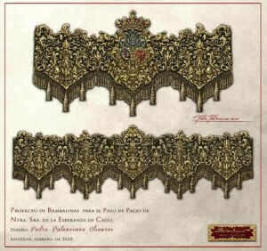 El proyecto de Palio para Nuestra Señora de la Esperanza llega tras la finalización de las labores de restauración llevadas a cabo en la orfebrería del paso de Palio y consta de la realización de bambalinas exteriores, bambalinas interiores, techo de palio, restructuración y potenciación de los respiraderos, faldones y como culmen un nuevo manto.