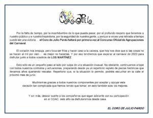 En la mañana de hoy martes, el coro de Julio Pardo comunica en su redes sociales que no participara en el COAC 2022. Son numerosas bajas que se esta sucediendo en este COAC aplazado por el tema Covid.