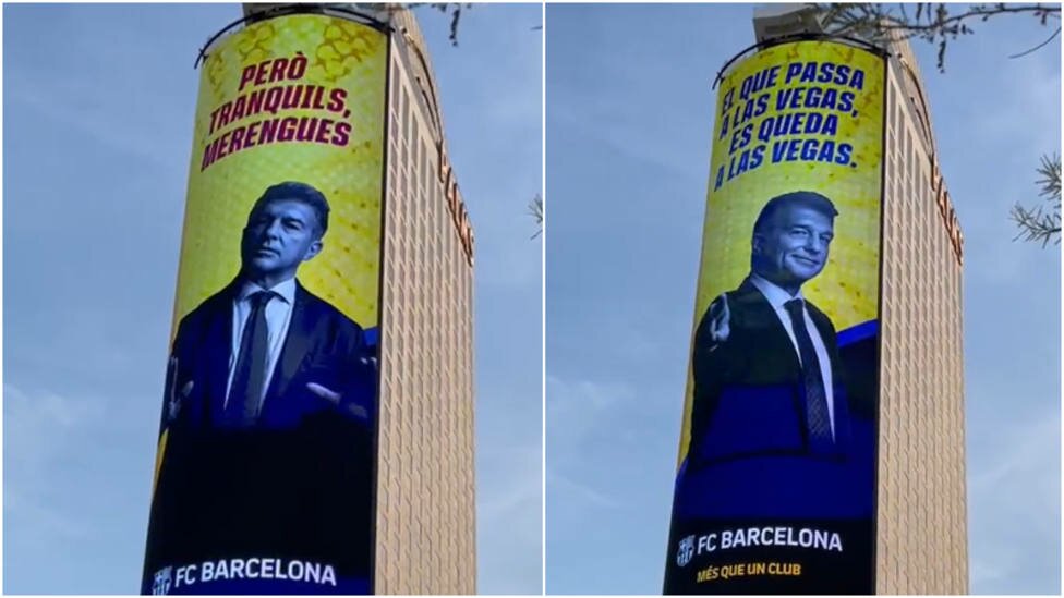 No es la primera vez que un Laporta tamaño XXL lanza algún dardo a su eterno rival mediante carteles gigantes. Ya lo hizo durante su campaña electoral para volver a ser presidente del Barça, cuando colocó una lona en las cercanías del Santiago Bernabéu con el slogan «Ganas de volver a veros». Ahora lo ha vuelto a hacer, pero en Las Vegas.