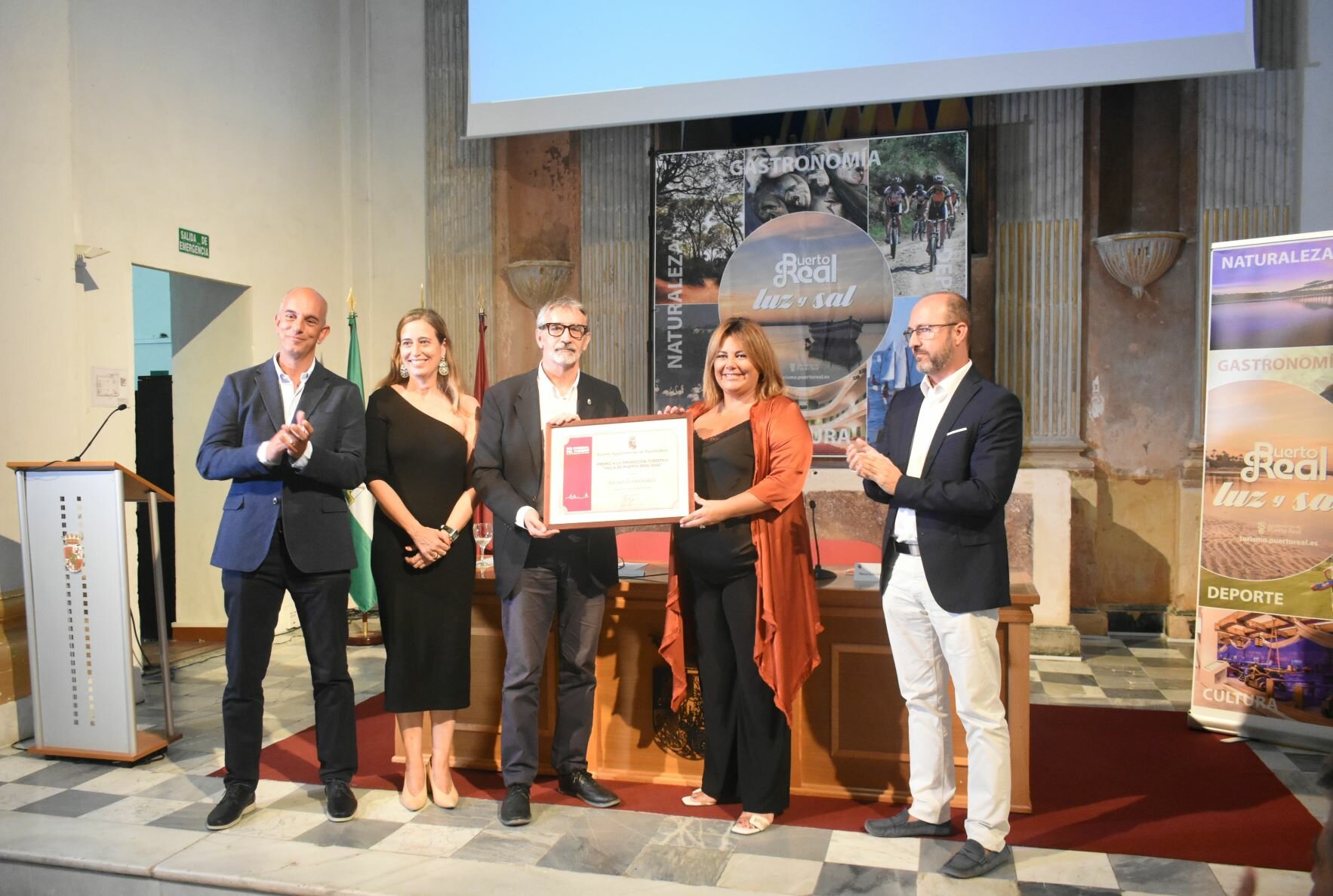 La alcaldesa de Puerto Real, Elena Amaya, y el delegado municipal de Turismo, Manuel Izco, han entregado en la tarde de este martes a Salinas La Esperanza el Premio a la Promoción Turística Villa de Puerto Real 2022. El premio ha sido recogido por Alejandro Pérez Hurtado de Mendoza, «el alma de estas salinas», en un acto en el que también han estado presentes el rector de la UCA, Francisco Piniella, así como otros intregrantes de la Corporación municipal y de la Universidad de Cádiz.